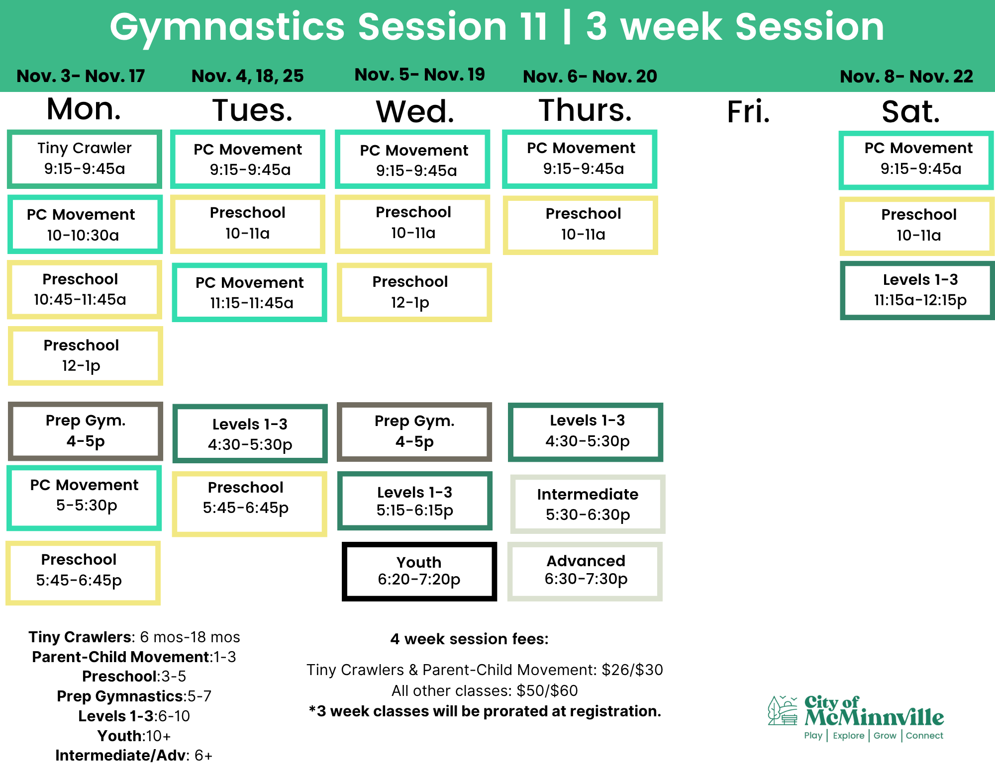 *3 week classes will be prorated at registration.
