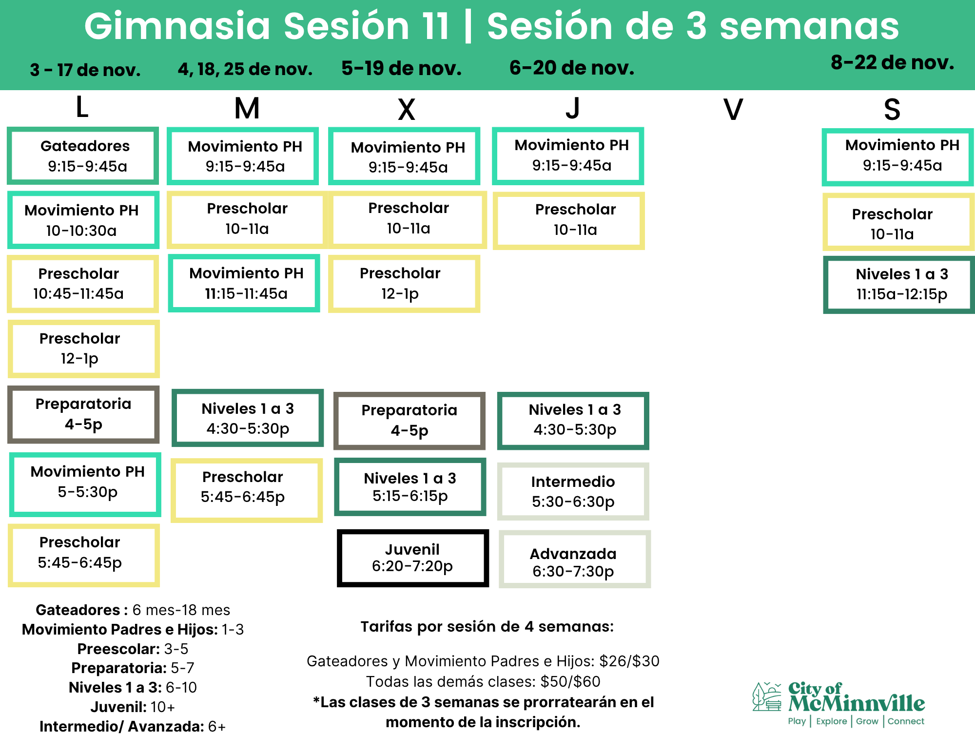 Todas las demás clases: sesión de 4 semanas $50 para residentes de McMinnville/$60 para no residentes
