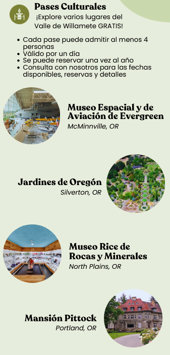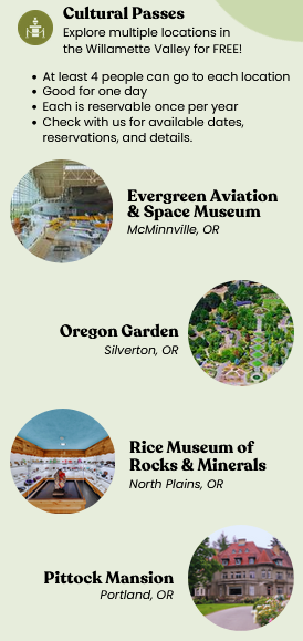 Cultural passes are available for free once per year per address with your library card. Check with the Circulation Desk, 503-435-5561, for available dates and details.